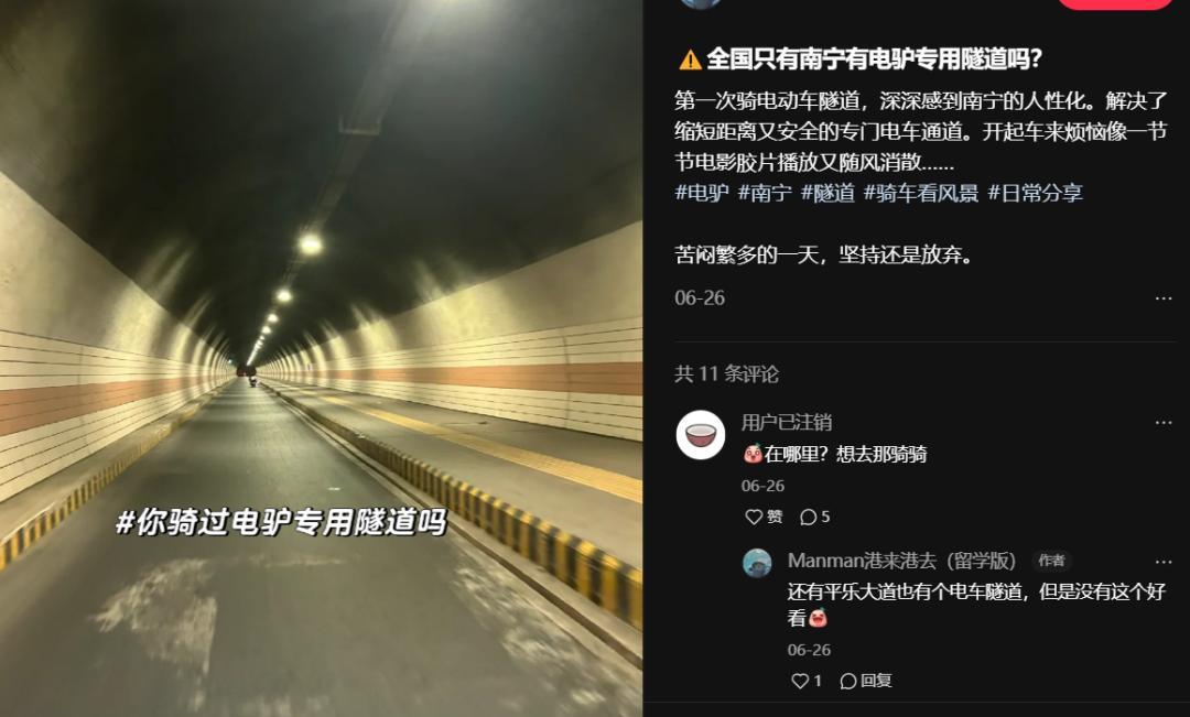 甚至,在南宁还有电瓶车专属的电鸡隧道!让不少外地人体验后不能自拔,“深深感到了南宁的人性化,开起车来烦恼像电影胶片播放又随风消散……”