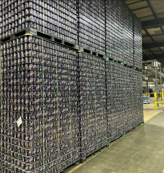 这是生产现场码垛的情况,可以看到照片中就有成千上万罐联动饮料被整齐堆码起来。