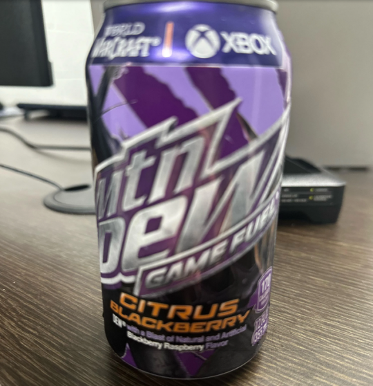 这是易拉罐的包装,可以清晰地看到xbox和魔兽世界的字样,口味为黑莓口味。