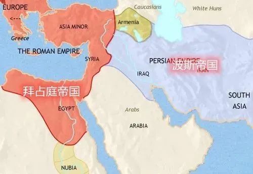▲处在拜占庭和波斯帝国夹击下的阿拉伯半岛