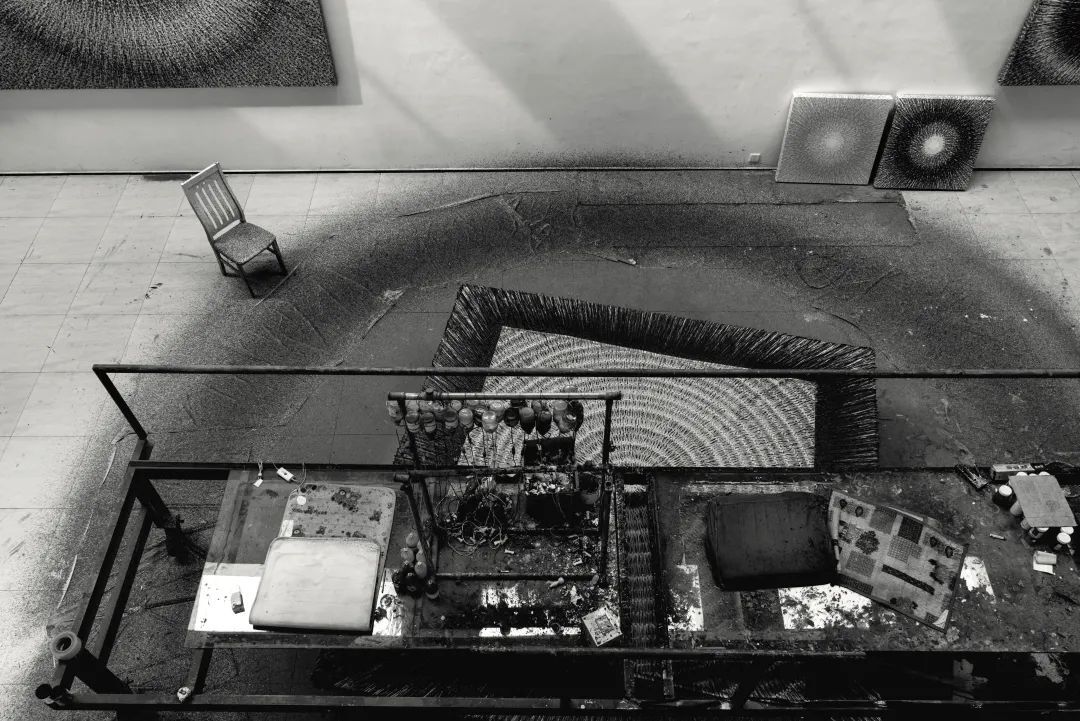 在长达数十年的时间中,孟禄丁没做过任何个展。他大多数精力是在对“圆”的机械式重复,圆与圆之间的变量,取决于圆的大小、颜色、机器转动的快慢与时长。又为了减少主题和故事的干扰,更好地体现“变化”本身,他尽量选择枯燥反复的“圆”作为唯一的形象,以让圆等同于世界的唯一单位。他的工作并非是传统的架上描绘,而是通过不断的创造和设定制度,以让制度与颜料、重力、速度之间产生无穷无尽的变量。