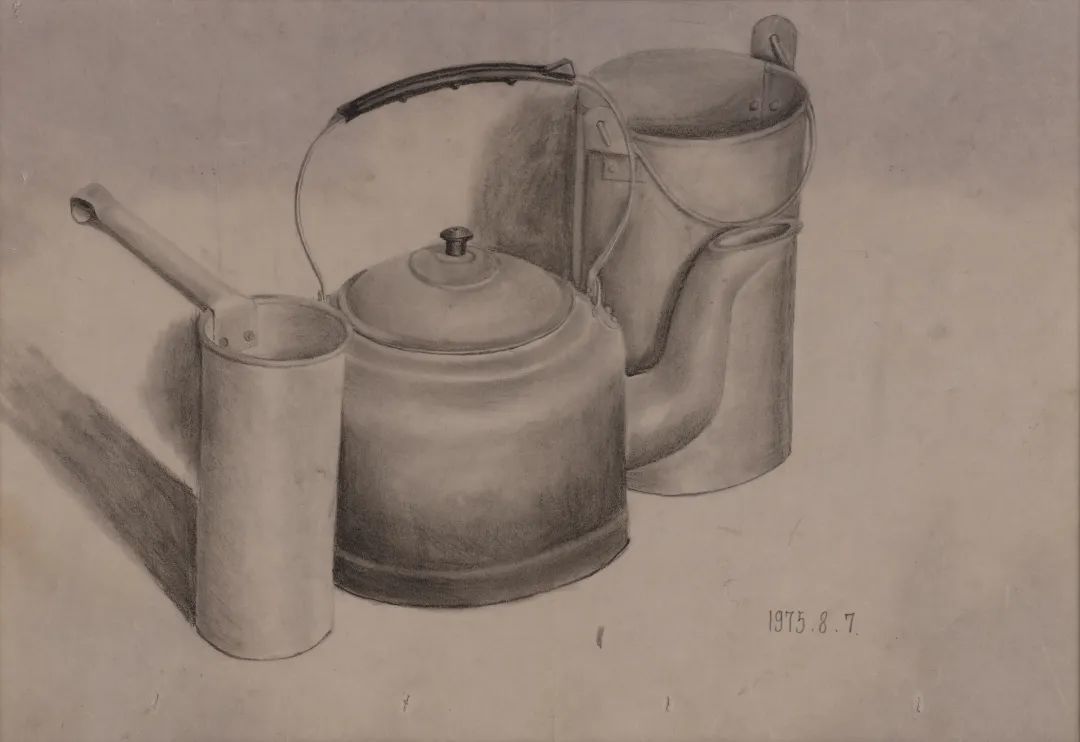 这些素描静物画的如此诚恳,因为笨拙,它接近于善良。也因为没有更多的办法,没有那些熟练、程式化的技法,这些日常之物被描绘得如此生动。它们仿佛就活在那里,活在早上的光线、遥远的日子里。如今看来,它有着记忆的质感,时空的距离,却又如此的新鲜,仿佛少年的孟禄丁,第一次看到它的情形。