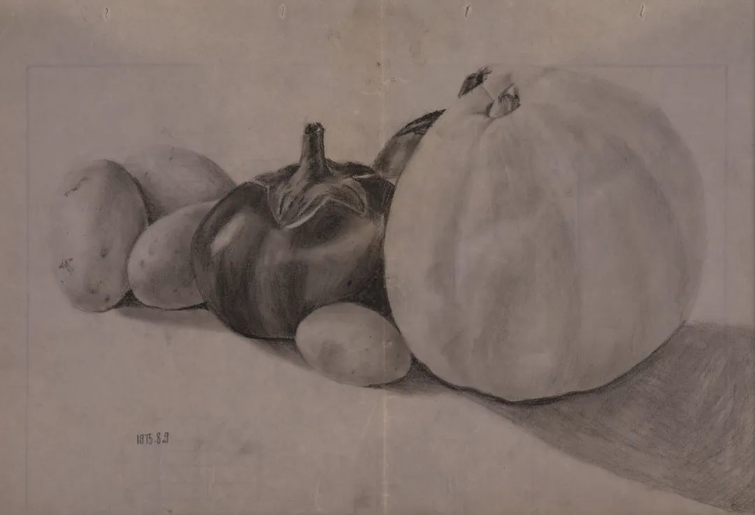 这些物品成了少年孟禄丁画中最好的对象。某些方面描绘它们,让这个孩子摆脱了孤独,有了最初的专注和自己的世界。火柴、皮包、瓜果、植物,或是铁锅、圆规、砖块,这些日常之物,被记录在父母留在家中的蓝色施工图纸上,冥冥之中这些抽象的图表感理性,若干年后将以另一种方式到来。