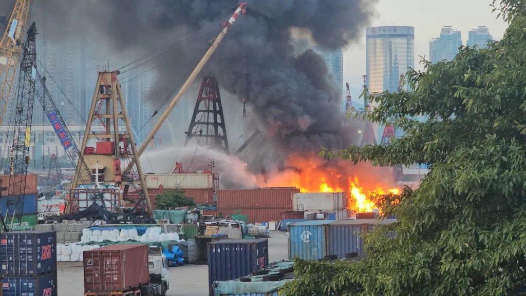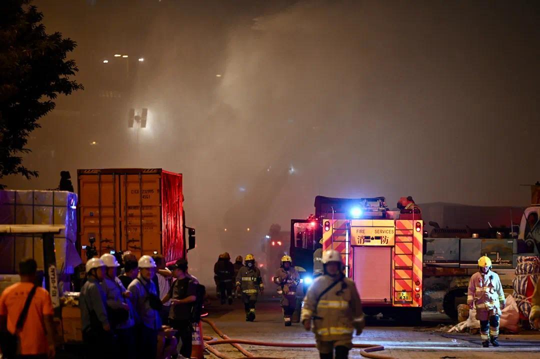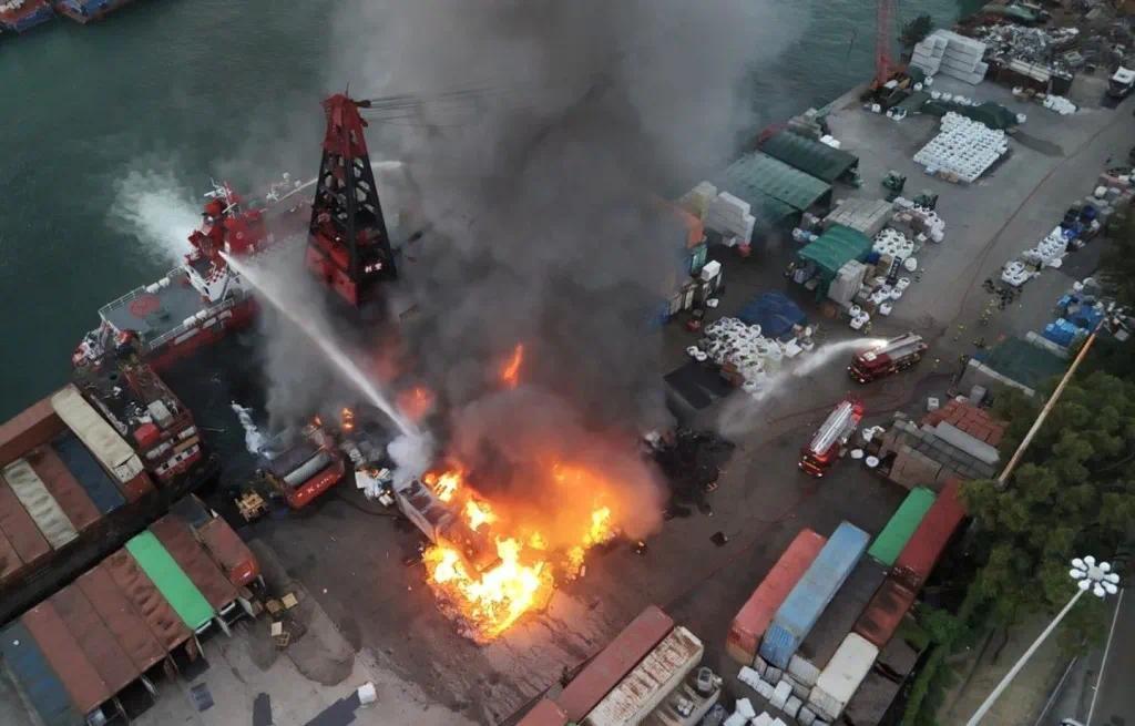 10月14日,香港新油麻地公众货物装卸区发生三级火,火势蔓延至附近船只,现场产生大量浓烟,多名消防员参与灭火。