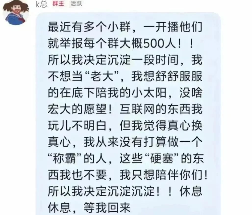 在宣布停播前一晚,“k总”的直播大号和小号遭遇连续封禁,其在粉丝群中透露,自己面临有组织的举报行为,涉及“多个小群”,“每群约500人”,一旦开播即进行举报,因此决定暂停直播,进行沉淀。