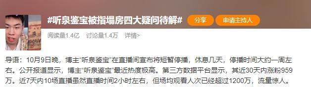 10月12日,在暂停播出三日后,话题#听泉鉴宝被指塌房四大疑问待解#迅速攀升至微博热搜,一度占据热搜榜第二位。据该话题的发起者上游新闻报道,听泉鉴宝面临粉丝对其学历造假、涉嫌盗墓连线及擦边连麦等多重质疑。