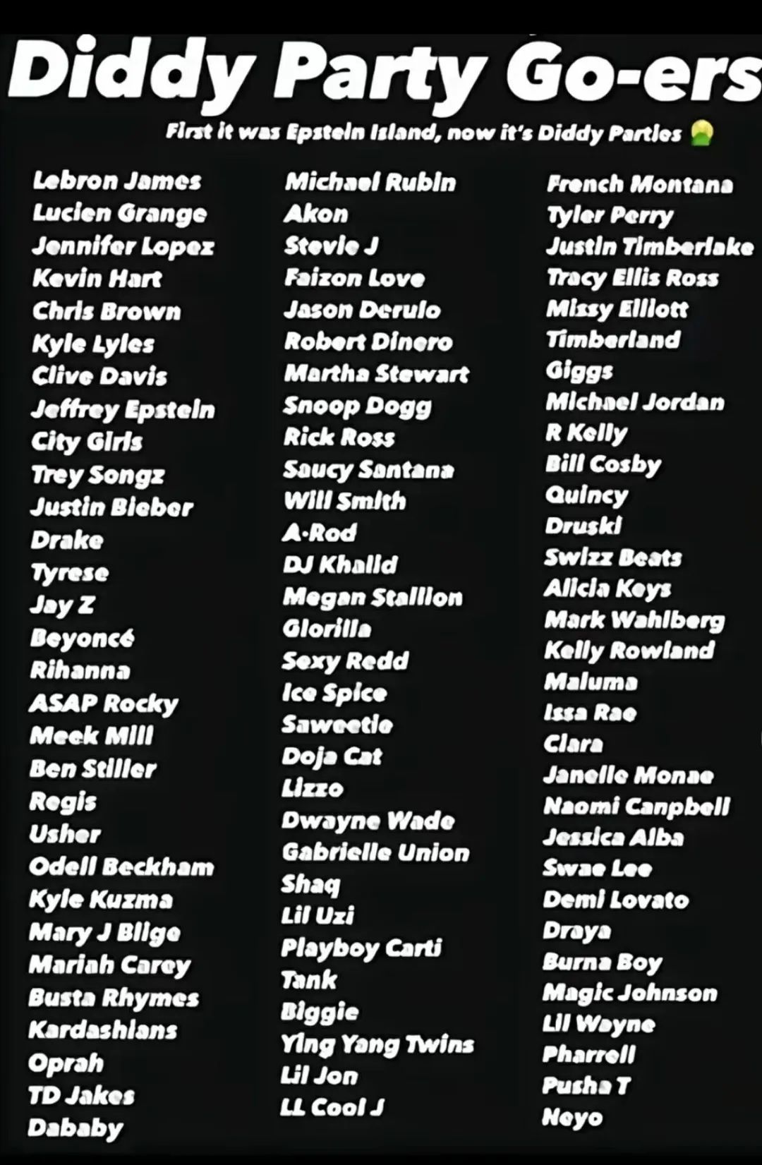 1998年至2009年,吹牛老爹共组织了11场“白色派对”,邀请的都是美国乐坛、影坛和时尚圈的顶级名流,碧昂丝、Jay-Z、小李子莱昂纳多、卡戴珊家族、球星詹姆斯、帕丽斯·希尔顿等一众名人皆在列。