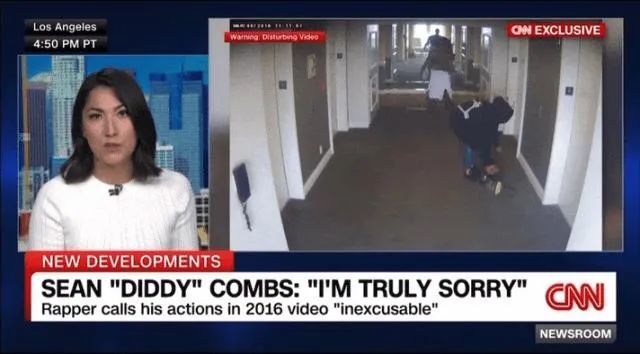 6 个月后,CNN公布了吹牛老爹在酒店走廊上将Cassie打倒在地并对她拳打脚踢的影像。视频中,吹牛老爹对正在等待电梯的Cassie进行殴打、脚踢,拖拽等一系列暴力行为。
