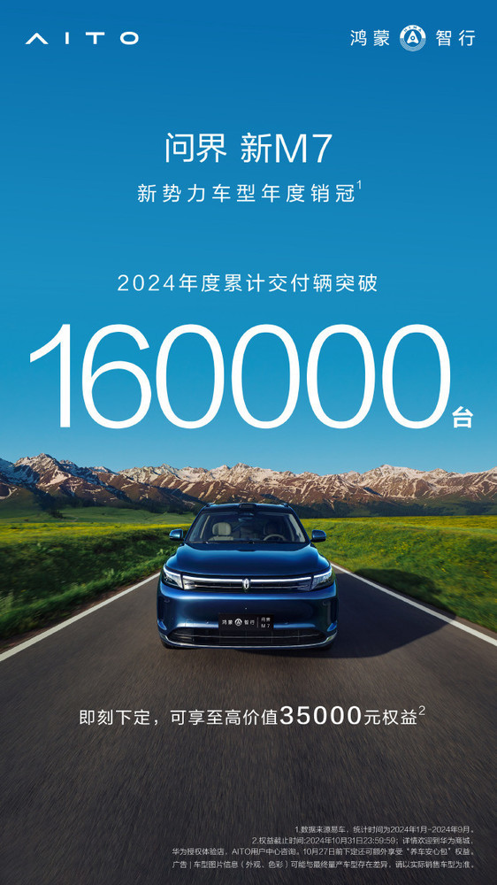 【CNMO科技消息】10月16日,AITO问界汽车官方宣布,鸿蒙智行国民SUV问界新M7 2024年度累计交付量突破16万辆,持续霸榜新势力车型年度销冠。