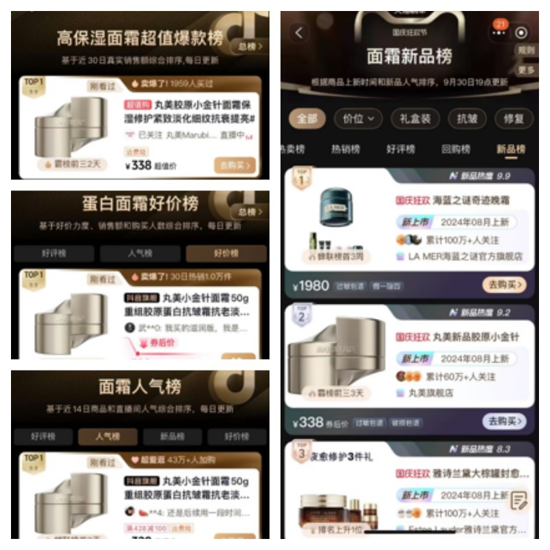 与此同时,在天猫平台上,丸美小金针面霜也展现出了非凡的竞争力。它不仅荣获了高保湿面霜超值爆款榜TOP1的殊荣,还在面霜新品榜上名列前茅,位列TOP2。这两个榜单的入围,不仅体现了丸美小金针面霜在保湿和抗衰老方面的卓越功效,更彰显了其作为新品的市场潜力和消费者期待。