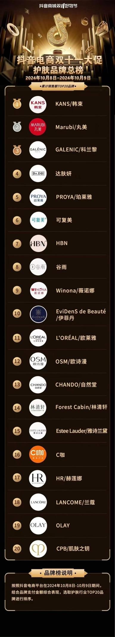 值得一提的是,随着双十一购物狂欢节的到来,丸美品牌再次展现出了强大的市场竞争力。在抖音电商双十一大促护肤品牌总榜单中,丸美荣获了第二名的佳绩,这一成绩不仅是对丸美品牌实力的认可,更是对其在双十一期间为消费者提供优质产品和服务的承诺的肯定。