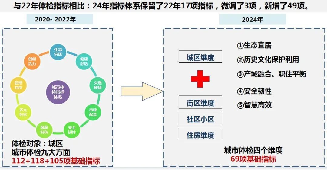 今年城市体检内容由2022年的城区维度九方面105项指标扩展到住房、小区(社区)、街区、城区(城市)四个维度14个板块69项指标,且由覆盖率指标转变为问题指标,直面问题,查找老百姓急难愁盼问题。体检颗粒度越来越细,查找出来的问题更具针对性,为下一步精细化治理提供了依据。