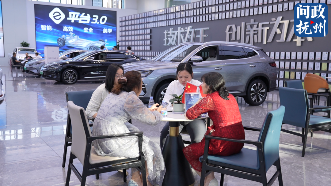 10月12日,记者来到抚州高新区比亚迪品牌体验中心,一进门就看见“以旧换新”补贴政策及优惠活动的宣传牌。门店内,前来咨询、购车的人络绎不绝,销售人员为顾客耐心地讲解汽车的性能特点和补贴政策,并引领顾客挑选心仪的车型进行试驾。