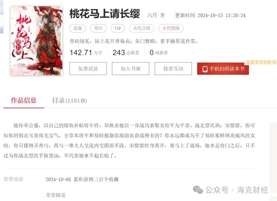 《桃花马上请长缨》共91集,单集2-3分钟,在调研机构DataEye统计的2024年9月短剧热力榜中排名第一。剧集的原著为同名小说,在起点中文网、番茄小说等平台连载,截至2024年10月15日已更新142.7万字。