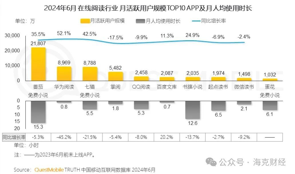 据QuestMobile数据,2024年6月,国内在线阅读行业MAU(月活跃用户数),番茄小说排名第一,达2.18亿;排名第二、三、四位的华为阅读、七猫小说、掌阅分别为8969万、8788万和5482万,其余平台MAU均不高于2500万;番茄小说的月人均使用时长同样排名第一,达15.3小时,第二位的是MAU为2035万的书旗小说,月人均使用时长12.6小时,其余平台月人均使用时长不超过6.5小时。