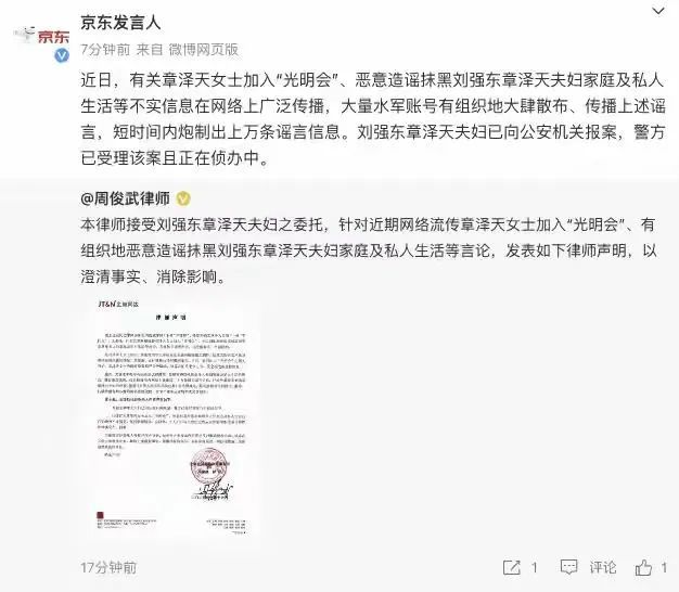 声明称。近日,有关章泽天女士加入“光明会”、恶意造谣抹黑刘强东章泽天夫妇家庭及私人生活等不实信息在网络上广泛传播,大量水军账号有组织地大肆散布、传播上述谣言,短时间内炮制出上万条谣言信息。刘强东章泽天夫妇已向公安机关报案,警方已受理该案且正在侦办中。