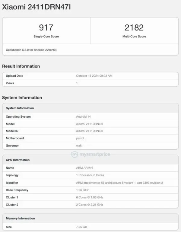 Geekbench揭示,Redmi 14C 5G采用骁龙4 Gen2移动平台,基于4纳米节能工艺打造,拥有6+2核心架构,包括6个1.96GHz节能核与2个2.21GHz性能核。此外,手机支持8GB内存,运行Android 14系统。