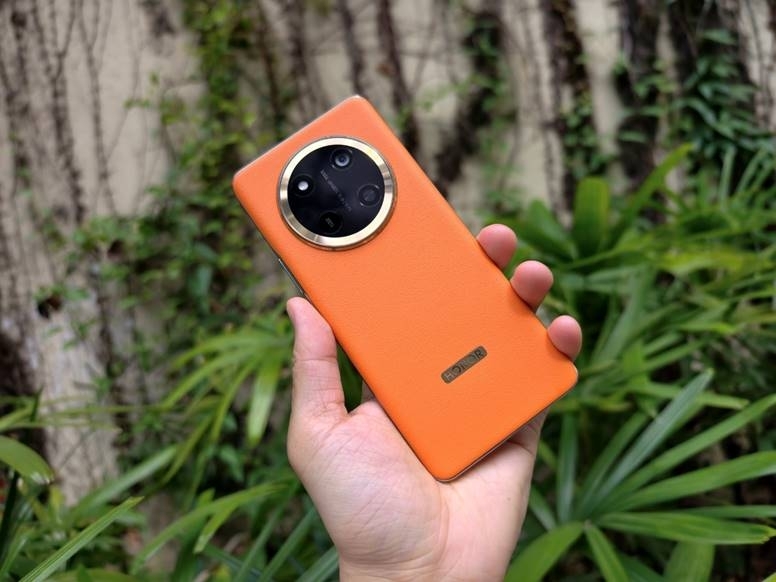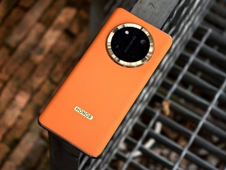 荣耀X60系列本次推出荣耀X60 Pro和荣耀X60两个版本,其中荣耀X60 Pro提供天海青、玄武灰、燃橙色、典雅黑四个颜色,荣耀X60提供月影白、海湖青、典雅黑三款配色,天极网拿到的是其中荣耀 X60 Pro的燃橙色。新机依然采用星环的设计语言,镜头Deco金色元素与燃橙素皮后壳相呼应,正脸双曲面设计,握持贴合手掌。