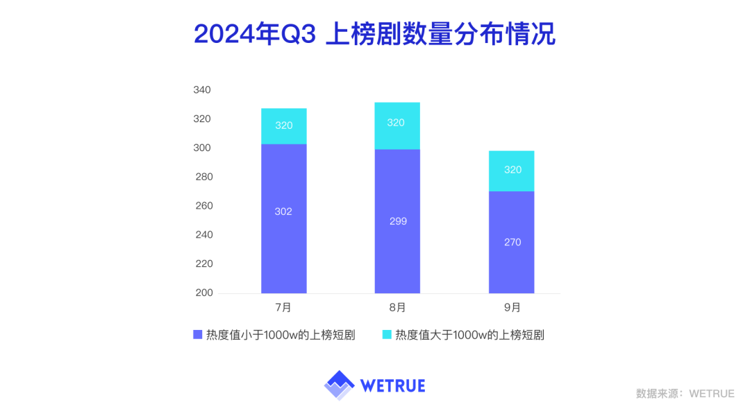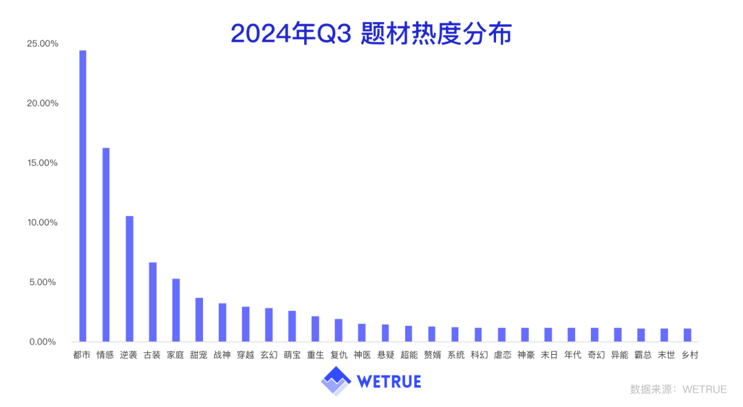 WETRUE数据显示,2024年7-9月,都市、情感、逆袭这三类题材占据前三名,延续了Q2的热门题材。