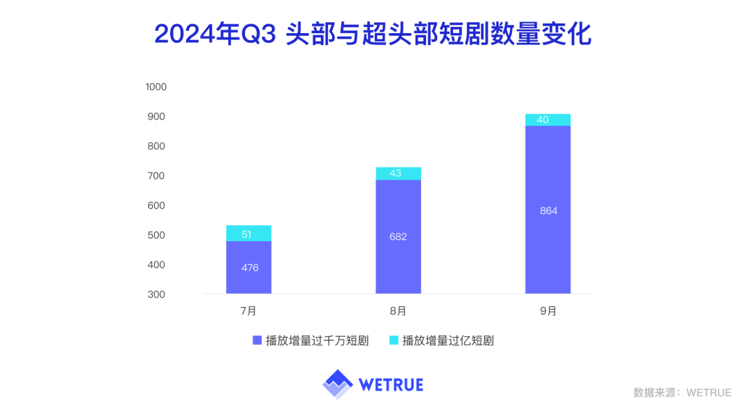 端原生账号在增加时,播放增量过千万短剧的短剧数量明显增加,从7月的476部,到8月的682部,最后到9月的864部,头部公司也已然进场。吊诡的是,播放增量过亿的短剧数量不增反降了,由7月的51部降至40部。