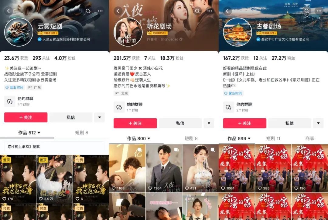 而不少制作公司、版权公司也逐步从幕后走向台前,例如战狼影业上线“云雾短剧”剧场与小程序,听花岛上线“听花剧场”原生帐号,西安丰行上线“古都剧场”原生帐号。
