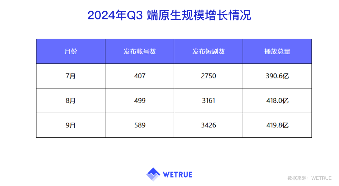 从表中看到,从7月至9月,端原生账号发布数量分别为407、499、589,对应的短剧数量为2750、3161、3426,能明显发现端原生市场规模在增长。与此同时,端原生播放总量从7月至8月,由390.6亿增长至418亿后,到了9月的播放总量变化不大,为419.8亿。