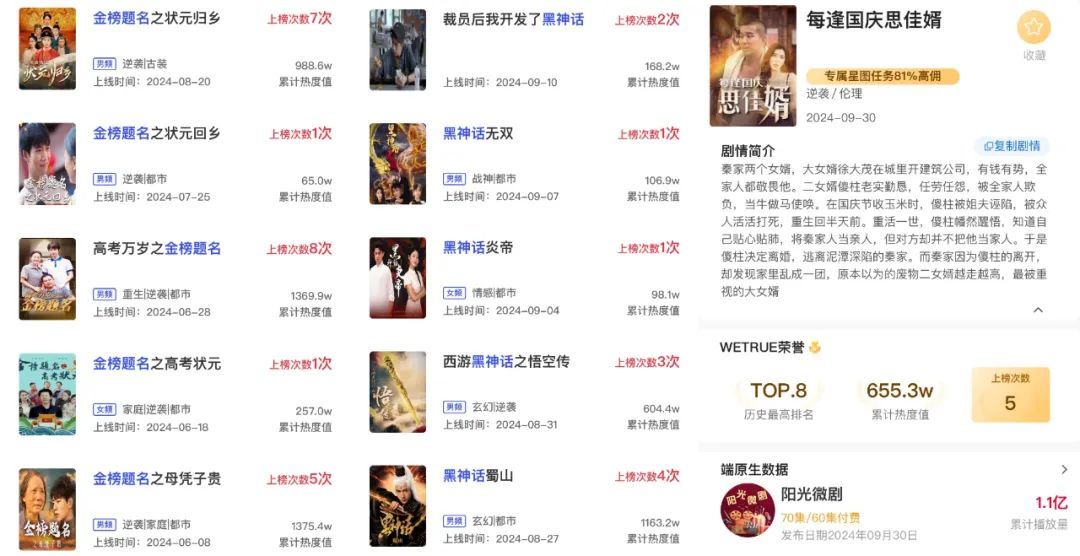 行业的工业化能力提升,对热点、节日能更快响应。像高考前后的 “金榜题名” 系列;游戏《黑神话:悟空》爆火后,相继被推出的“黑神话”系列;点众在国庆期间推出《每逢国庆思佳婿》。众多公司响应迅速且成绩斐然,热点与节日带来了足够的热度与流量,同时满足了观众在某一时段的情感需求,也展现出了短剧产业链短、平、快的响应优势与短剧拍摄的工业化水平提升。