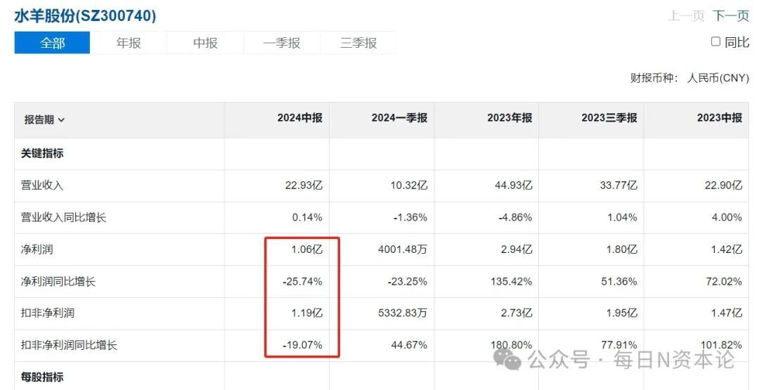水羊股份的业绩也不稳定。2018年上市当年净利润同比就下跌17.53%,2019年净利润仅有两千多万,同比大跌79.17%。2020年和2021年净利润持续回暖,最高至2.36亿元,但2022年净利同比再度近腰斩。2023年又奇迹般同比飙升135.42%,2024年中报净利润同比又下跌25.74%。
