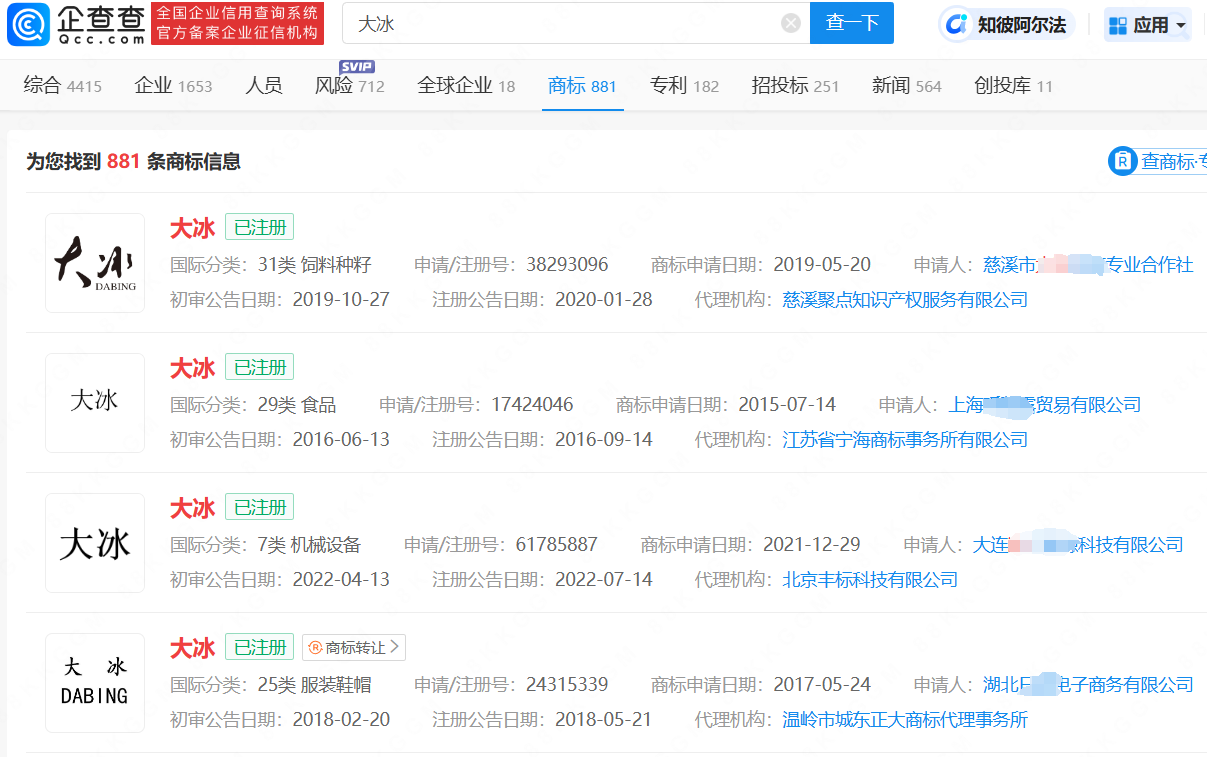 企查查APP显示,“大冰”“大冰的小屋”相关商标已被多家企业及自然人成功注册。其中,2022年,大冰名下焉冰文化传媒(上海)工作室将所持“大冰的小屋”商标全部转让至西藏天堂时光文化传播有限公司,大冰名下企业现无“大冰”相关商标。