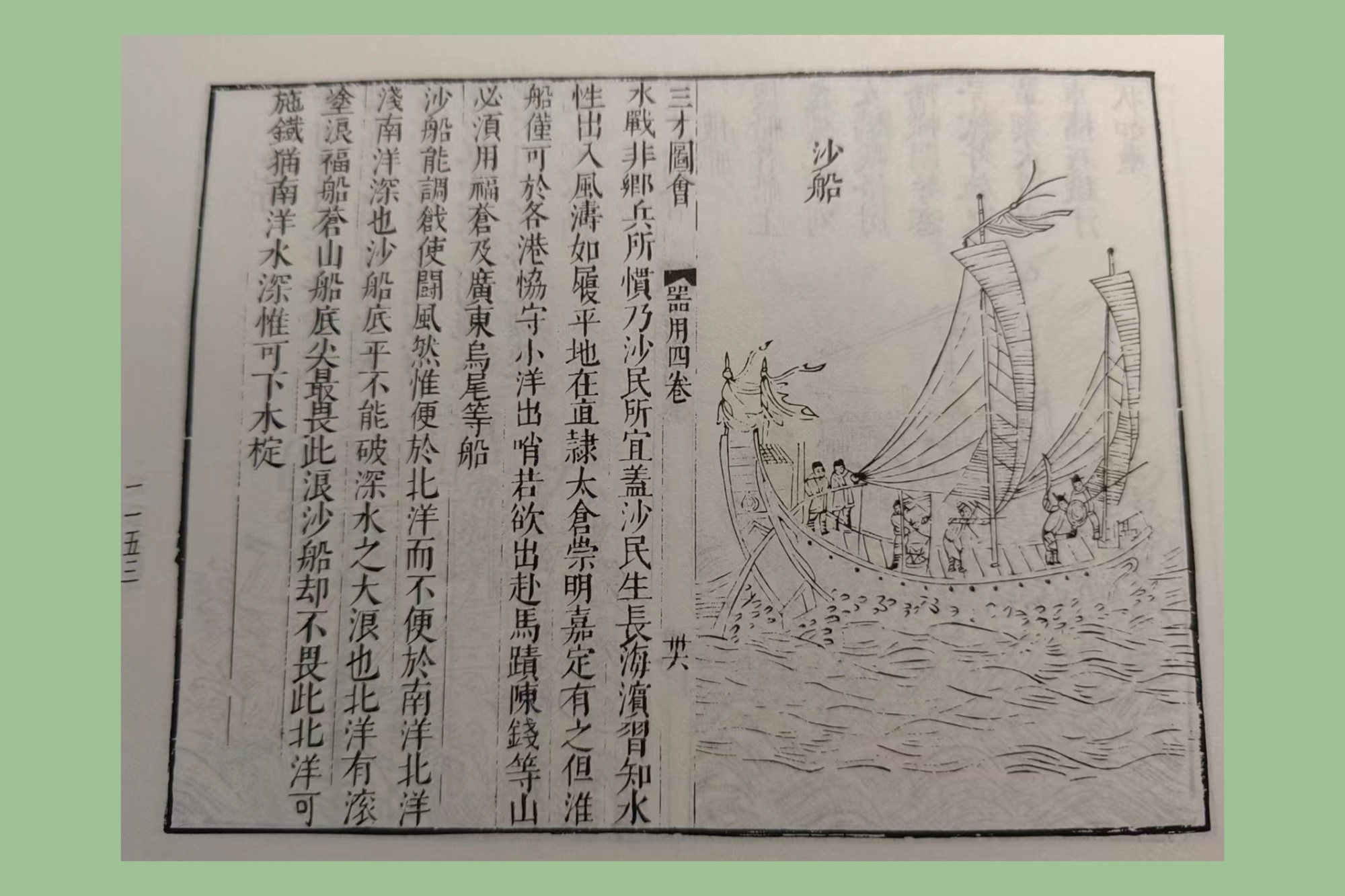 沙船是长江口一带的平底海船,中国三大古船型之一,其结构适合在近海浅滩行驶,是上海古代的对外与内陆贸易中的主要船型。《三才图会》器用卷中收录了从先秦古玉到元明农业器械等诸多生活之物,也涵盖船只,对沙船平底、翘头的外形特征勾勒生动,对其使用地区记录如下:“在直隶、太仓、崇明、嘉定有之”。