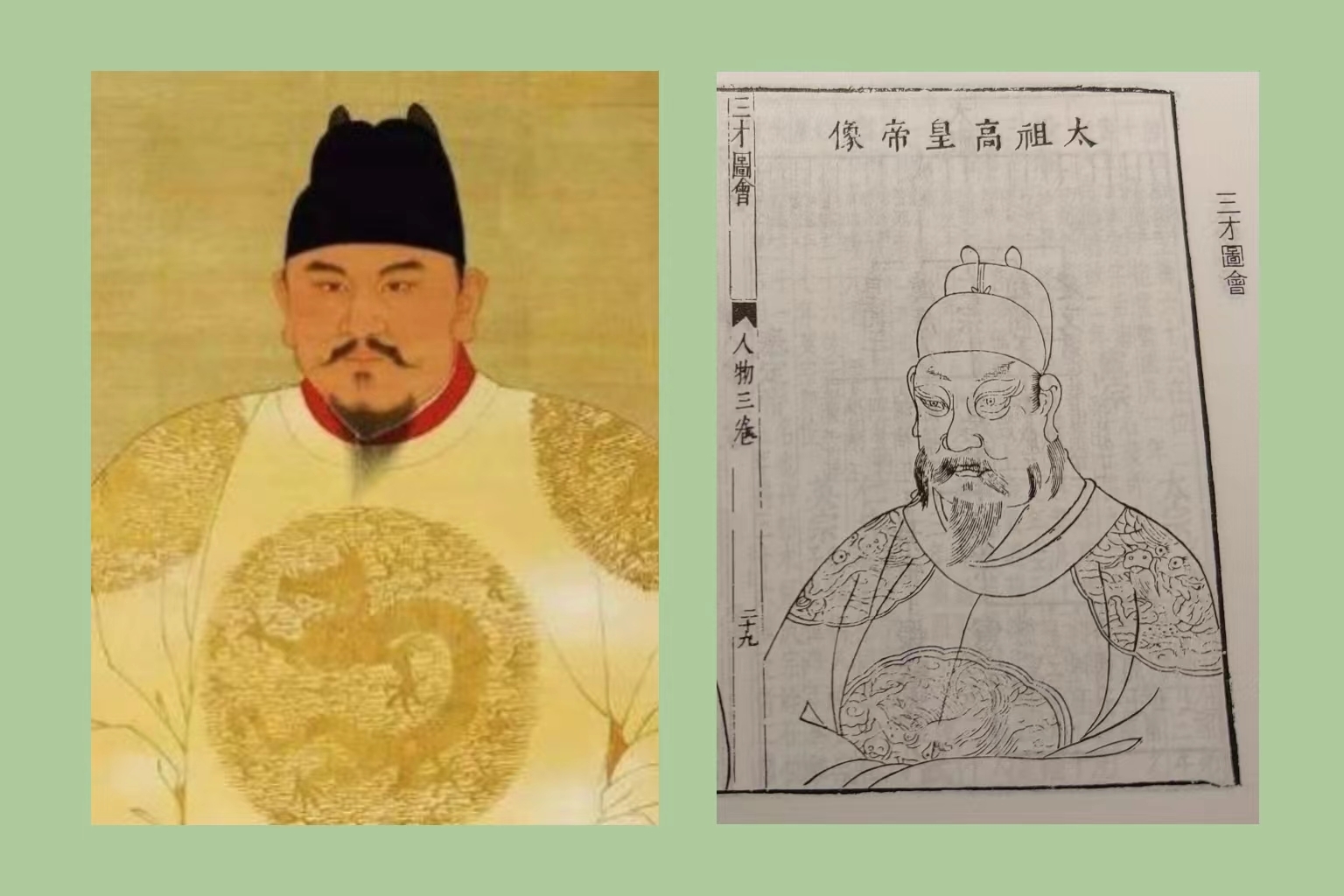 另一类则是距离成书年代更近,有着较为可信的画像流传的历史人物,例如明太祖朱元璋。故宫博物院中收藏有一幅明朝宫廷画像,被学界认为最有可能与朱元璋的真实外貌相符。对于元代及以后的人物,由于材料更加丰富,《三才图会》画像中开始出现更多样的作画角度、更具辨识度的面部特征,王圻所作朱元璋画像就在许多细节特征上与故宫画像相似,如较低的额头、较为硬朗的下颌轮廓等,眼型也不再是如仙似神的凤眼。