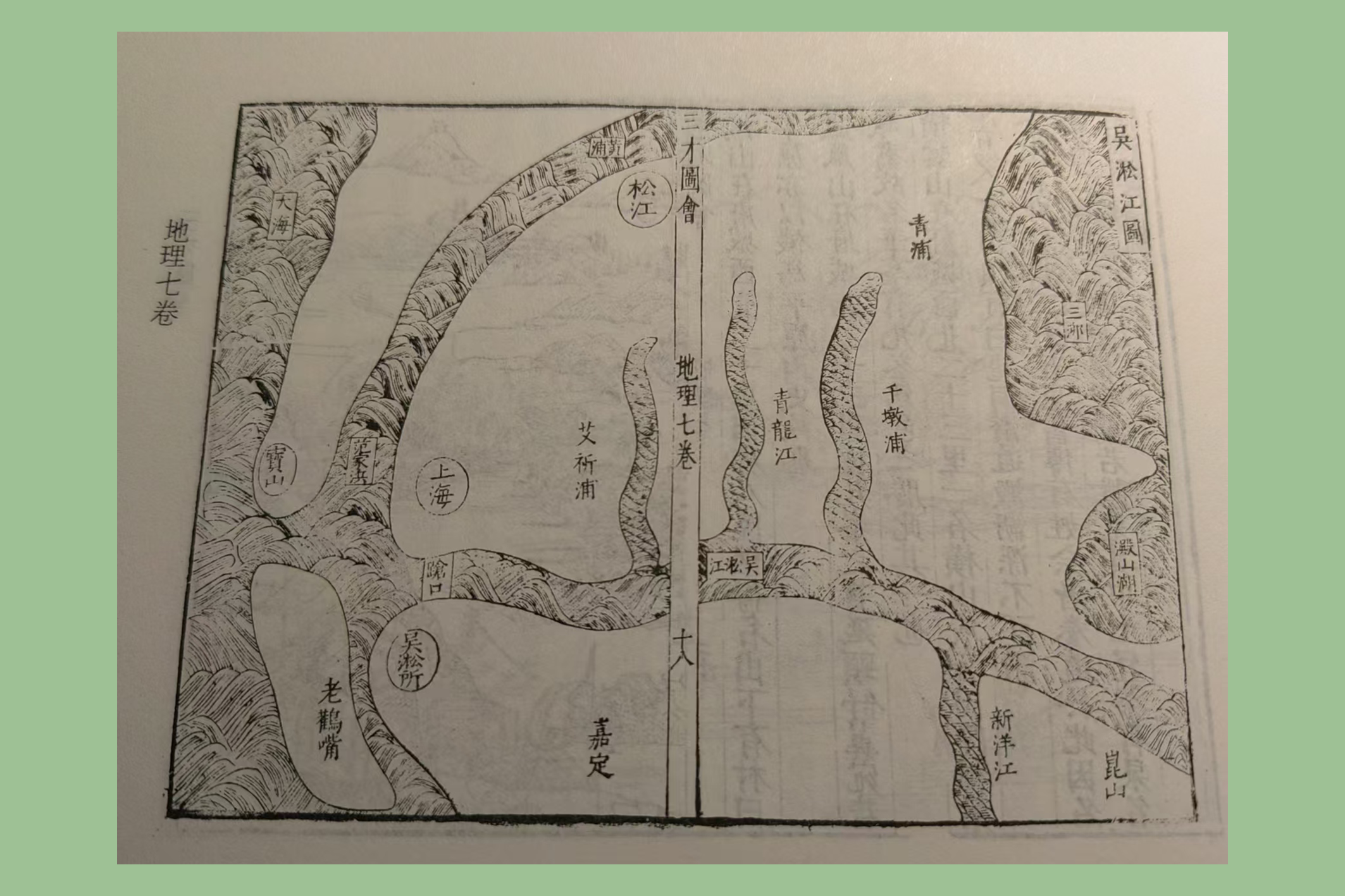 今天上海地区在明朝时不是独立的政治区划,在《三才图会》中没有单独的地图展示,但在水系卷中以吴淞江图的形式被较完整地呈现出来。吴淞江图中标注出了“上海”、“宝山”、“松江”、“青浦”、“嘉定”等上海古地名,是独特而宝贵的历史资料。