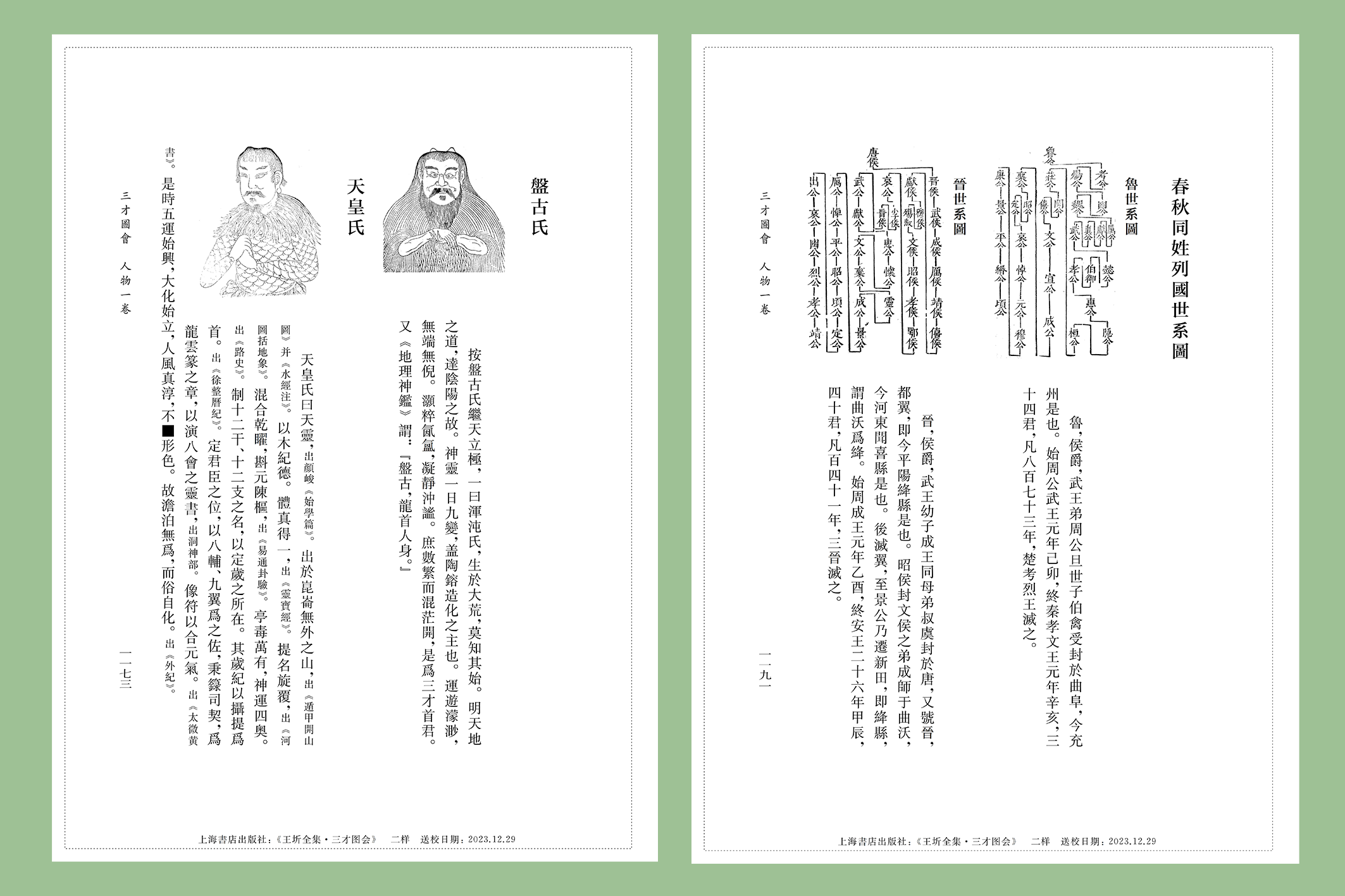 上海书店出版社《三才图会》部分内页图 左:人物卷中的盘古氏与天皇氏 右:春秋同姓列国世系图