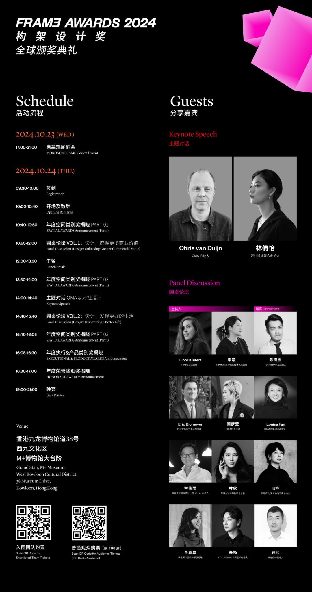 颁奖礼现场将会是了解全球最新设计趋势,拓展商业机会的舞台,面向正期待以设计赋能转型的企业品牌,以及期望在空间(产业)中注入更多的创新创意内容,希望获得专业权威的背书赢得更多高端创意人士关注的企业。购票参与请扫下方二维码: