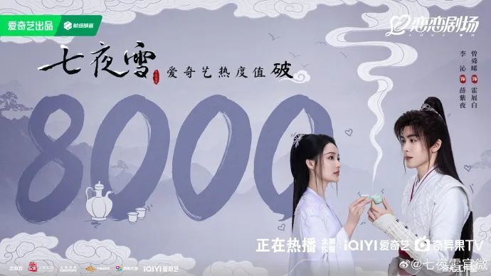 剧上周刚开播,热度就嗖嗖突破8000大关,直接登顶猫眼网剧热度榜Top1,社媒上也是讨论不断,#七夜雪暧昧拉扯 #七夜雪感情线细腻 #曾舜晞被原莲花楼武术指导硬控住了等话题不断刷新微博热搜词条,#这才是古装剧喂药的正确打开方式等情节细节不时冲上小红书热搜榜……