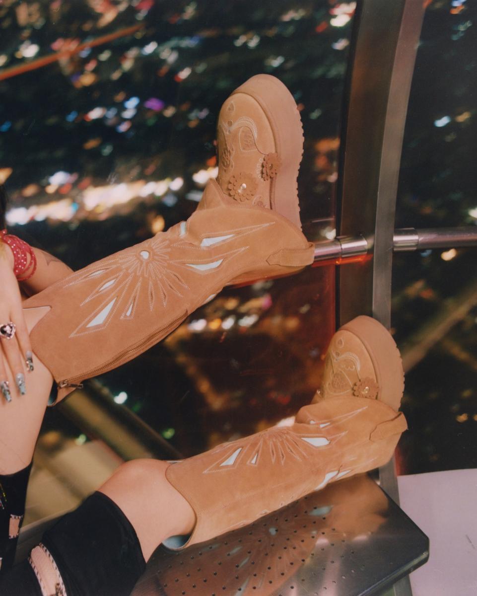 本次联名“千禧牛仔靴”是以UGG经典Mini Dipper迪普靴作为基础重新设计而成,鞋面设计融合了UGG经典太阳花与YUEQI QI品牌标志性的热压爱心图案,融合双方的品牌魅力和个性化风格,带领每位穿着者共同感受“爱”的温暖,同时也希望大家能够探索人与城市之间的深刻情感纽带。