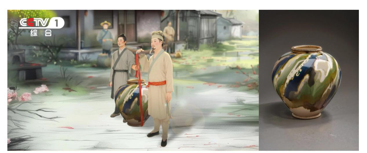 《小儿垂钓》场景中的陶罐来自陕西历史博物馆“唐三彩罐”的动画复原