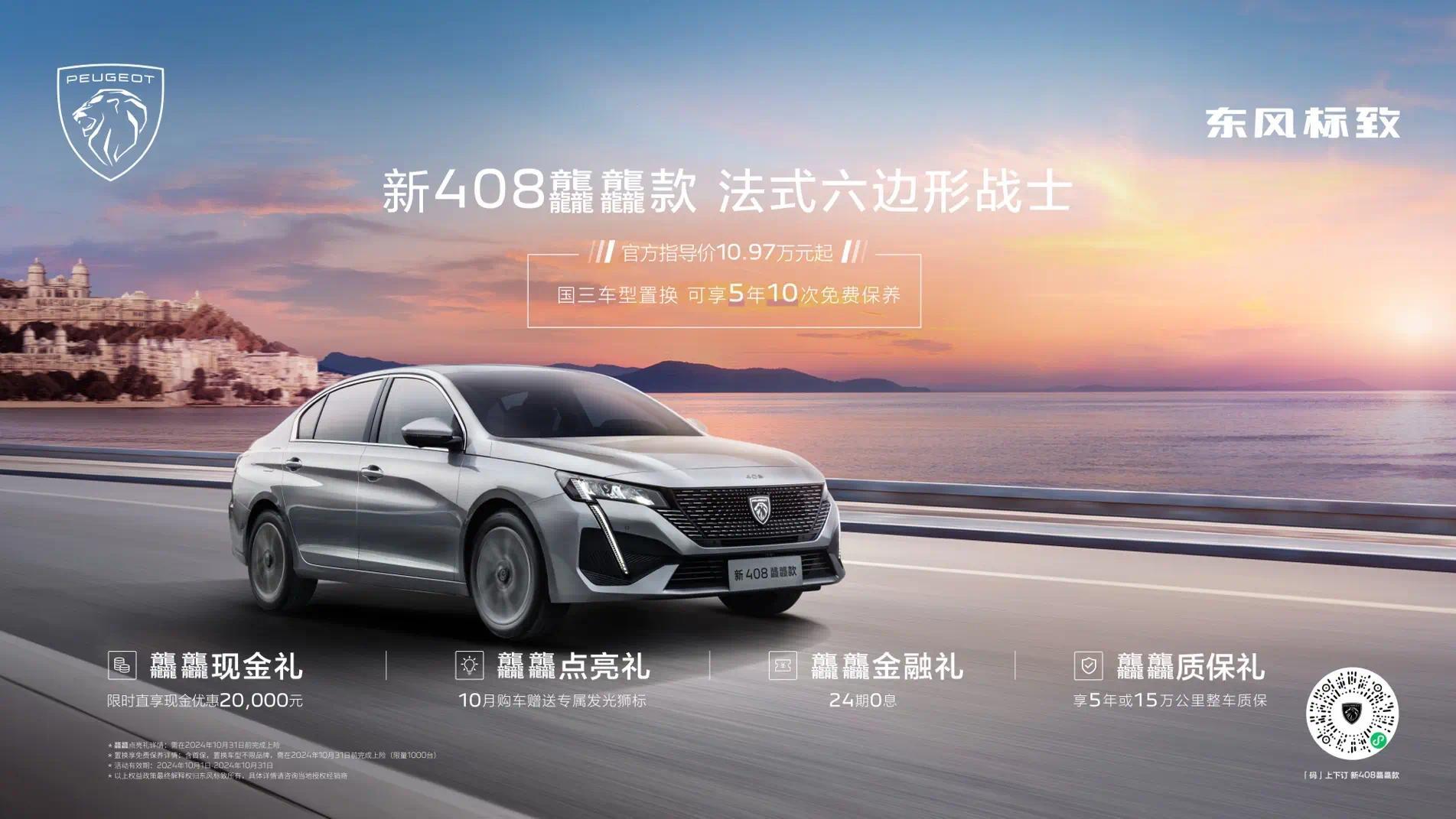 值得一提的是,十月购买东风标致新408龘龘款,还可享多重知音好礼,包括“限量置换礼”,国三车型置换可享5年10次免费保养;“龘龘现金礼”,限时直享现金优惠20000元;“龘龘点亮礼”,购车赠送专属发光狮标;“龘龘金融礼”,24期0息;“龘龘质保礼”,享5年或15万公里整车质保。