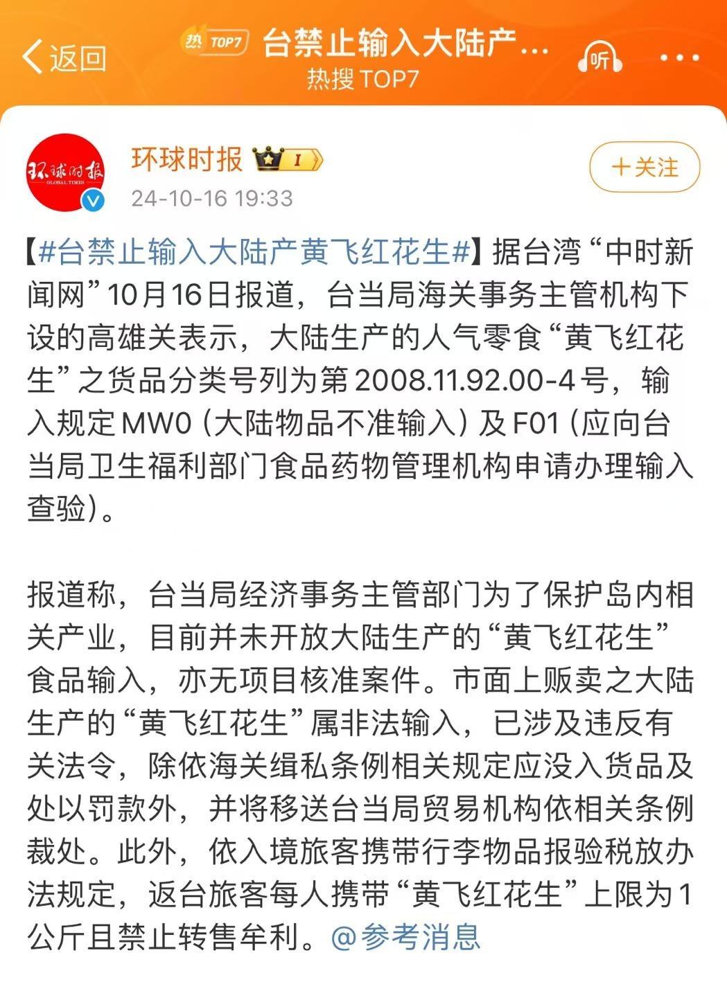 该报道刊发后,“台禁止输入大陆产黄飞红花生”等话题很快登上热搜热榜,并且意外带火了黄飞红花生的销售。