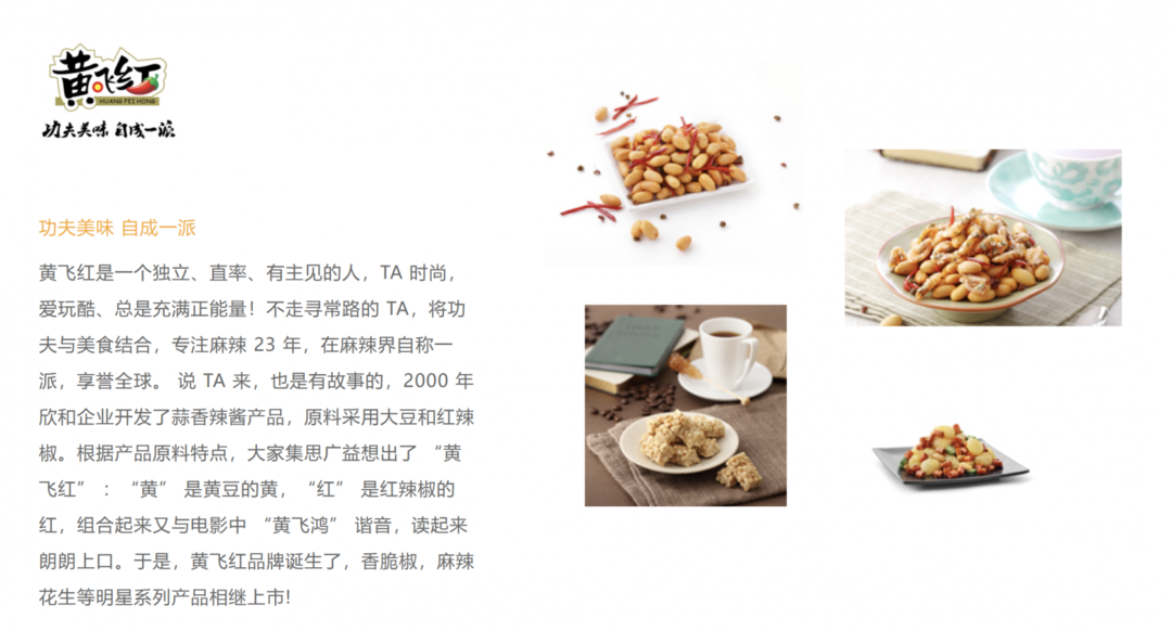 其中,黄飞红品牌开发于2000年,原料采用大豆和红辣椒。“黄”是黄豆的黄,“红”是红辣椒的红。香脆椒、麻辣花生等属于黄飞红品牌的明星系列产品。