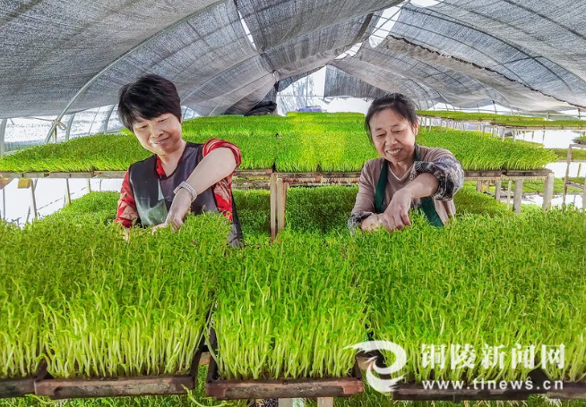 10月17日,在铜陵市铜官区西湖镇横塘村鑫木农业公司的芽菜种植大棚里,种植工人正在采收培育成熟的豌豆苗。据了解,该公司拥有大棚和温室1000多平方米,主要种植豌豆苗、花生芽、青豆苗等芽菜,目前日产芽菜约800斤,高峰时段达2000斤,年产值约210万元,带动村民就业34人。(储著传 张忠平)