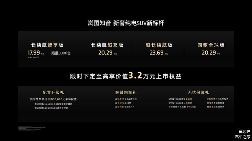 作为参考,岚图知音此次上市共推出了4款配置车型,官方指导价19.69-23.69万元。值得注意的是,除了上市权益外,岚图知音针对入门版也就是指导价为19.69万元的长续航智享受版车型还带来了17.99万元的限量价(限量3000台)。