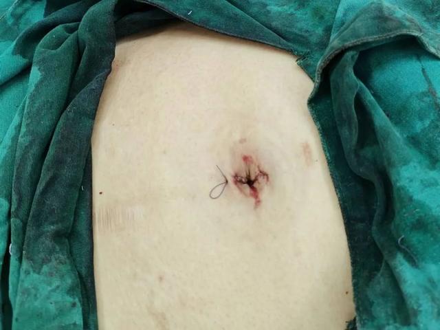 手术后,张女士的腹部恢复平坦,仅在肚脐处留下了一个大约3.5厘米的手术切口,且这个切口被巧妙地隐藏在肚脐的自然褶皱中。