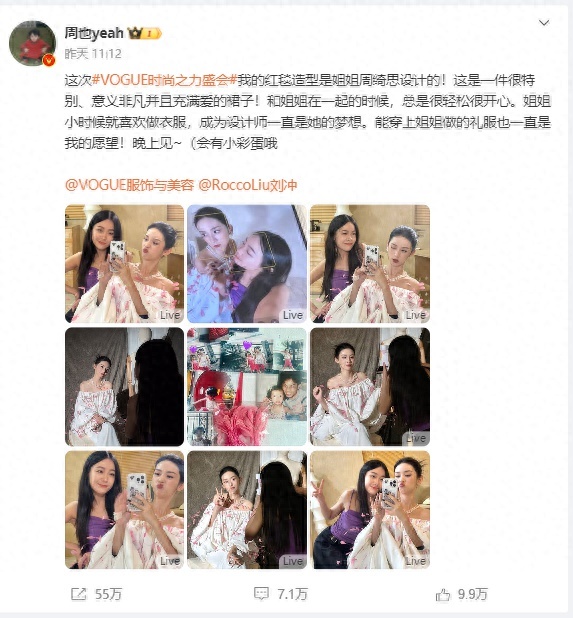 相关推文中,周也晒出此次身着礼服与姐姐的合照还有和姐姐的童年合影。