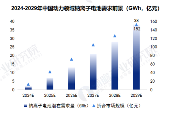 钠离子电池主要在短距离纯电动汽车以及电动两轮车领域具有较为广阔的潜在应用潜力。2018-2023年期间,我国纯电动汽车销量呈逐年增长态势,2023年达668.5万台,与此同时,两轮电动车销量亦呈稳步上升态势。随着钠离子电池在动力领域的渗透率提升,前瞻初步测算到2029年,中国动力领域钠离子电池需求前景将达到38GWh,市场规模约为152亿元。