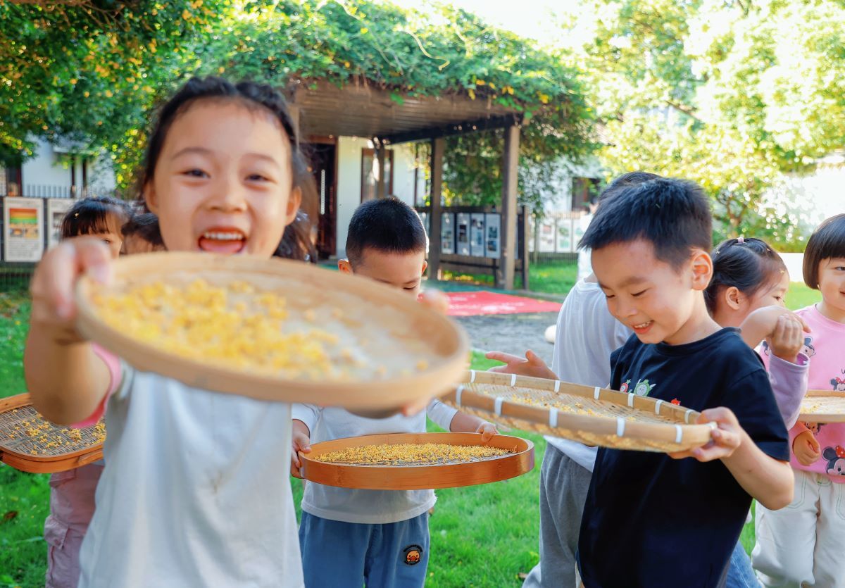 素园琴馆的桂花树也成了孩子们挥洒童真的“玩伴”,随着老师一声令下,摇桂花活动正式拉开序幕。孩子们拿着簸箕左右移动,小心翼翼地接着上方飘落下来的桂花。孩子们还在老师指导下,在美丽的桂花树下以桂花入画,制作一幅幅精美的桂花贴画。