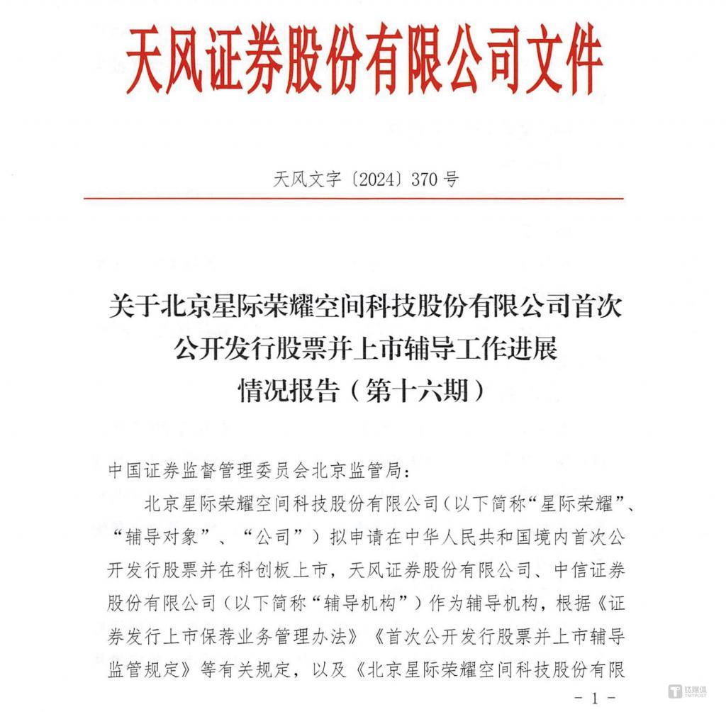 2020 年 12 月,星际荣耀完成股改及上市辅导备案,天风证券、中信证券为辅导机构,目前已经完成了 16 轮辅导工作,今年 7 月证监会官网公布了《关于北京星际荣耀空间科技股份有限公司首次公开发行股票并上市辅导工作进展情况报告(第十六期)》。