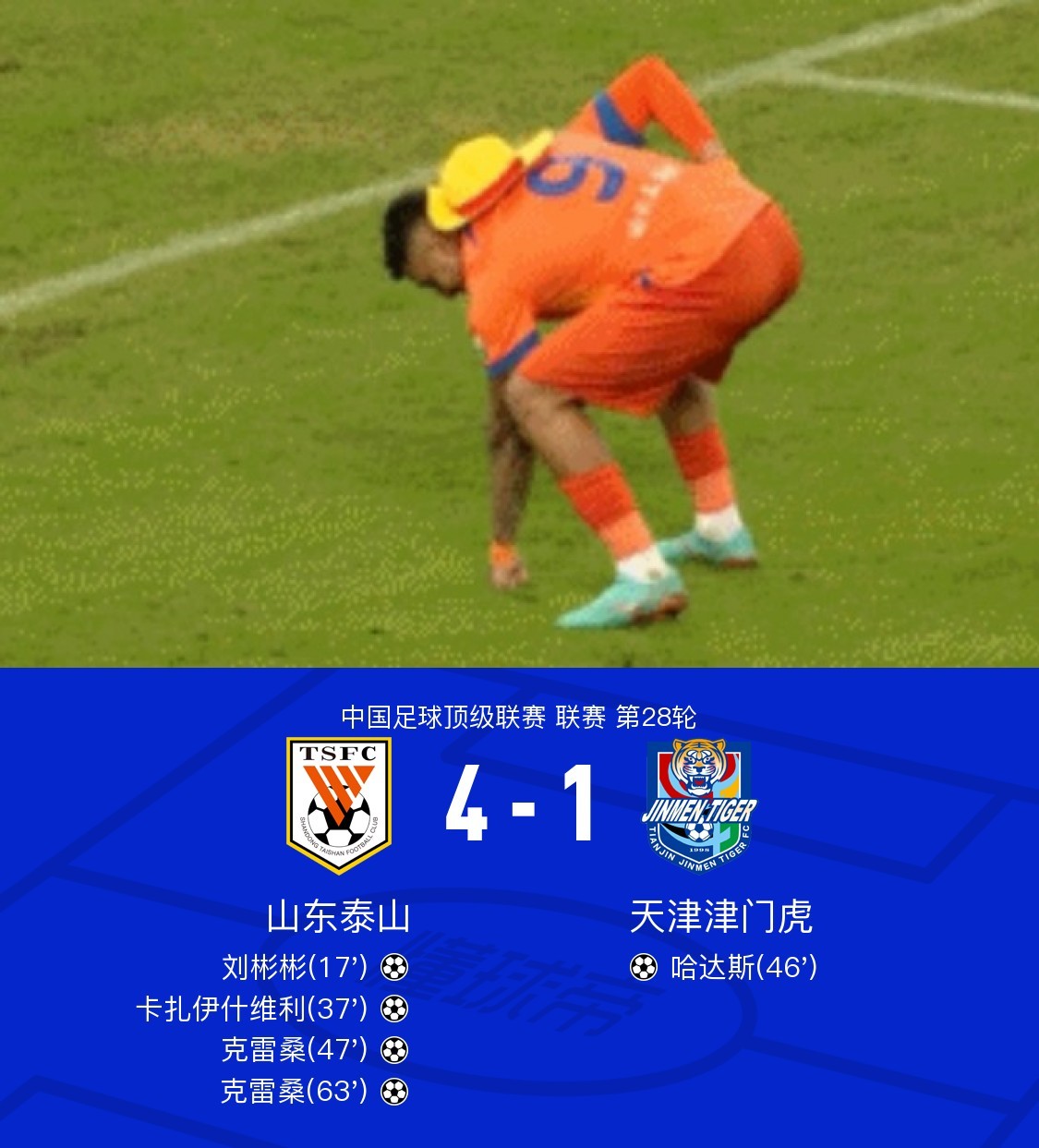在中国足球顶级联赛第28轮的比赛中,山东泰山坐镇主场迎战天津津门虎。比赛中,山东泰山的刘彬彬率先为球队打开局面,随后卡扎伊什维利也贡献了一粒进球。克雷桑表现出色,接连打入两球,完成梅开二度。天津津门虎方面,哈达斯为球队打入一球。最终,山东泰山以4-1的比分战胜天津津门虎,取得了本场比赛的胜利。