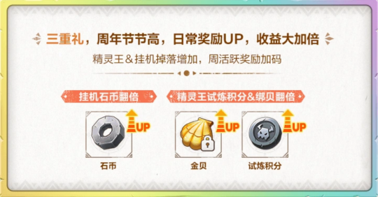 周年庆活动期间,为提升玩家的日常收益。《石器时代:觉醒》将挑战日常活动的奖励倍数,诸如精灵王试炼,精灵王积分、绑定金贝将翻倍掉落,以及挂机将获得翻倍石币!且周年庆活动期间,《石器时代:觉醒》对周活跃奖励进行限时加码,届时百宝袋、经验卡等惊喜道具也会现身其中,增加奖励力度。