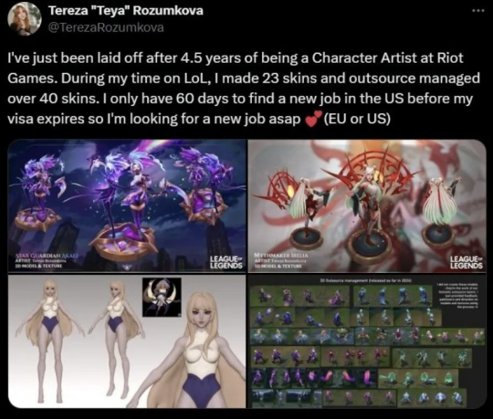 但很快就有玩家发现,他们喜欢的皮肤设计师TerezaRozumkova、插画师Riot Moon、模型师Ben Rosado等一批老艺术家们都被裁员了。